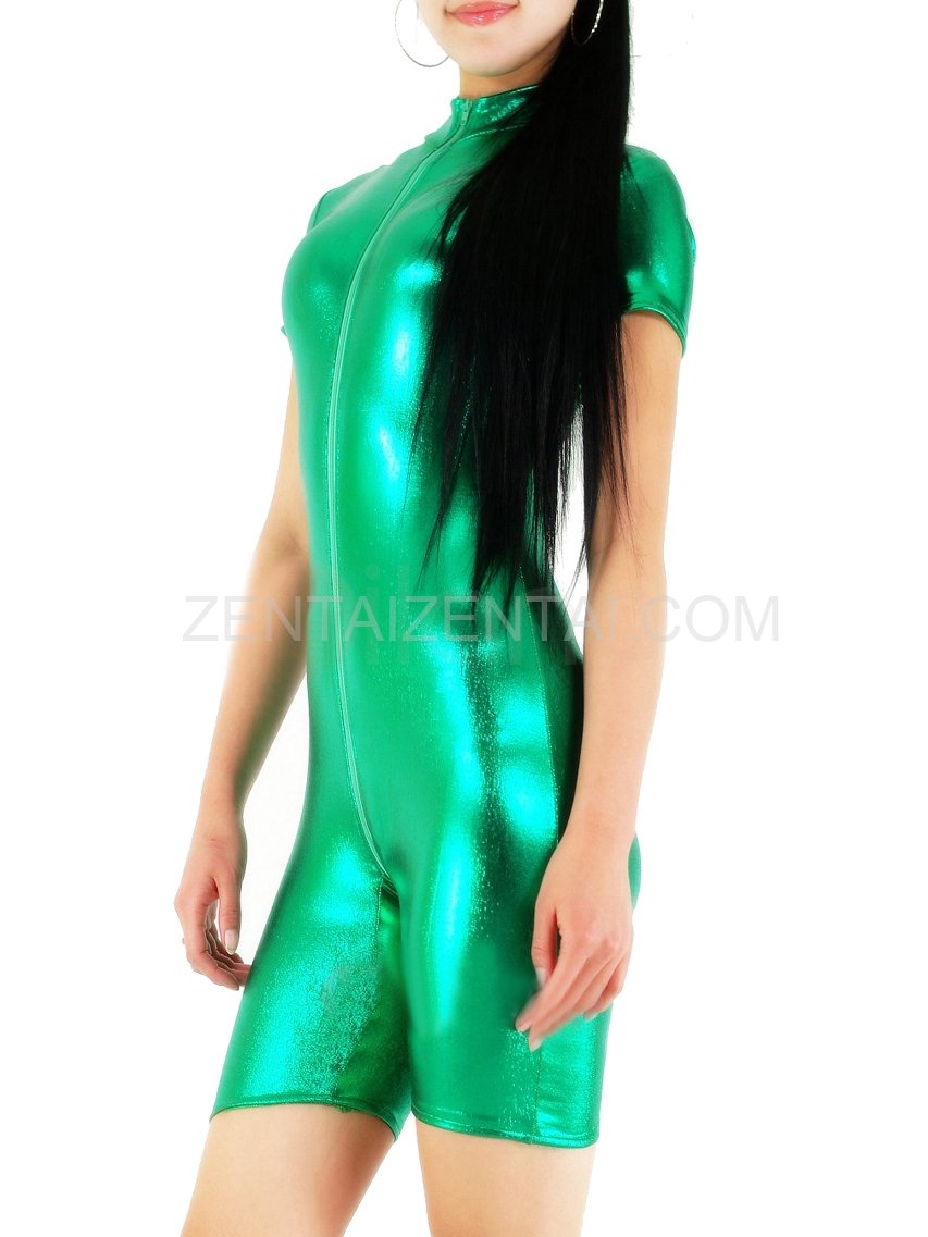 Half length catsuit with green shiny metallic material adopted, a one way zipper is added for the front opening purpose. This catsuit is hood and shoes excluded. The catsuit accessory is available for this suit.